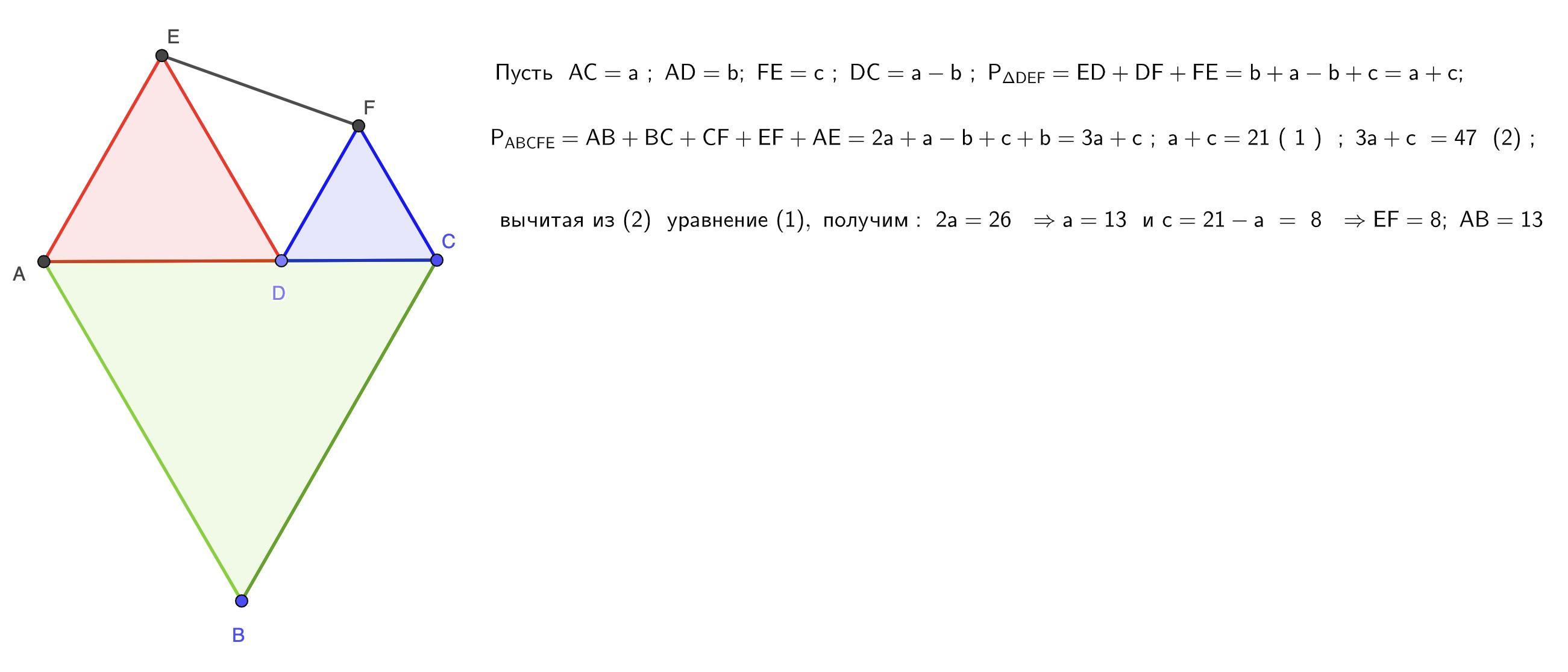 СРООЧНО ДАМ 15 БАЛЛОВ.На стороне AC равностороннего треугольника ABC отмечена точка D. На отрезках AD и DC во внешнюю сторону от исходного треугольника построены равносторонние треугольники ADE и DCF. Известно, что периметр треугольника DEF равен 21, а периметр пятиугольника ABCFE равен 47
