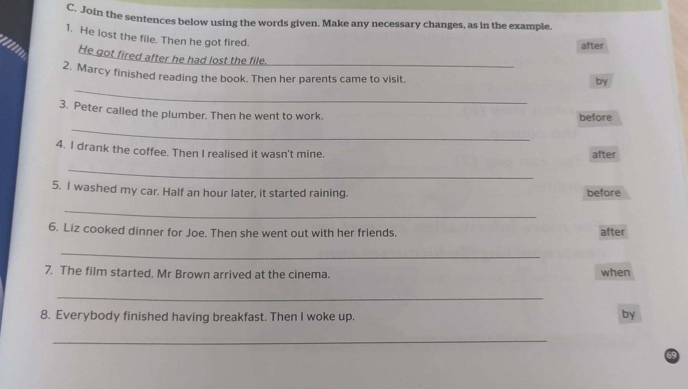 2)marcy finished her book by her parents came to visit