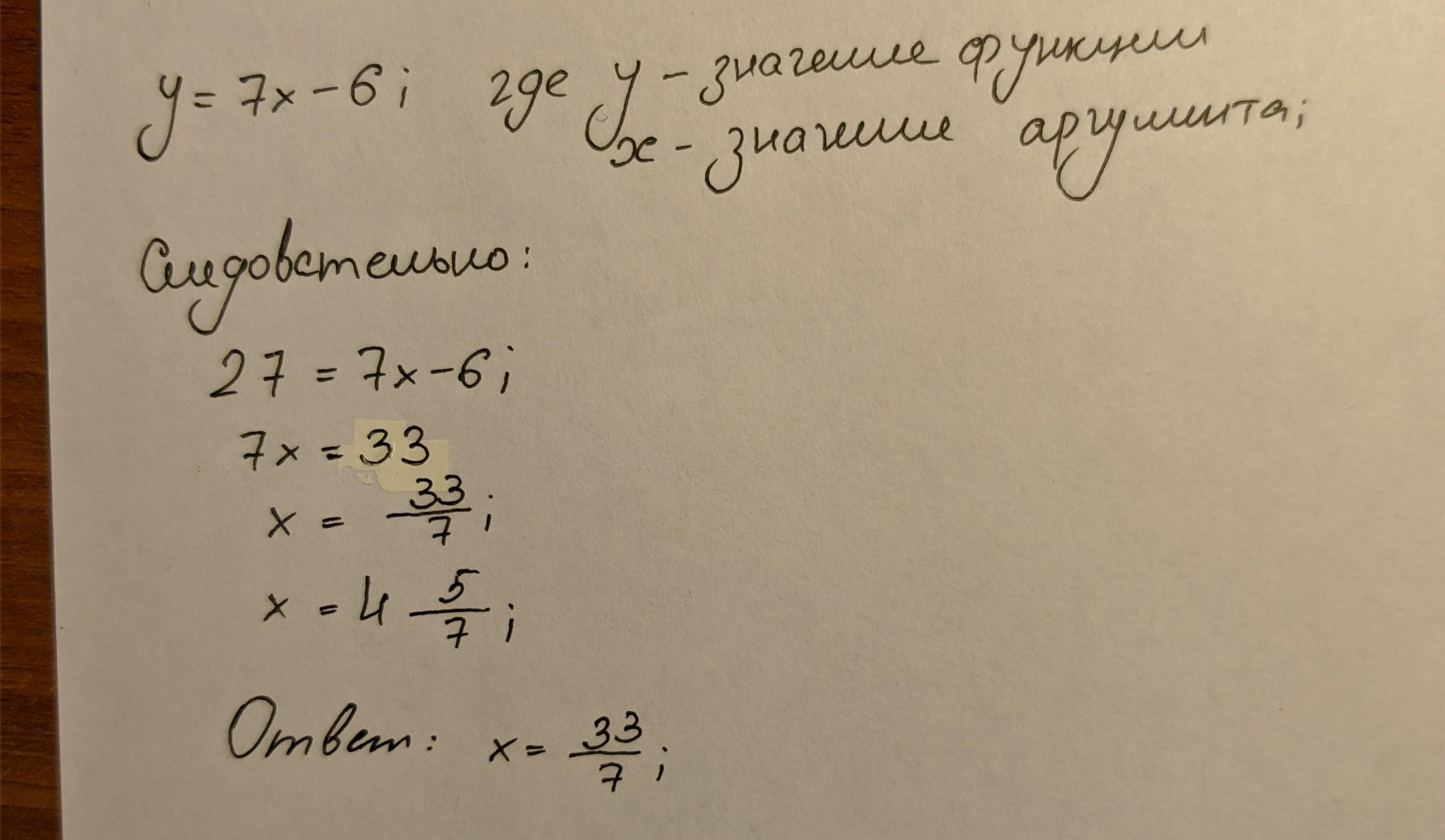 Определите, при каком значении аргумента функция у=7х-6 принимает значение, равное 27? * Мой ответ