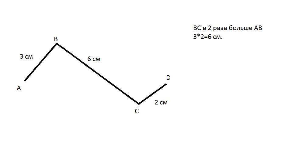 начертить ломаную ABCD у которой длина звена AB 3см, длина звена BC в 2 раза больше длины звена AB, а длина звена CD 2 см