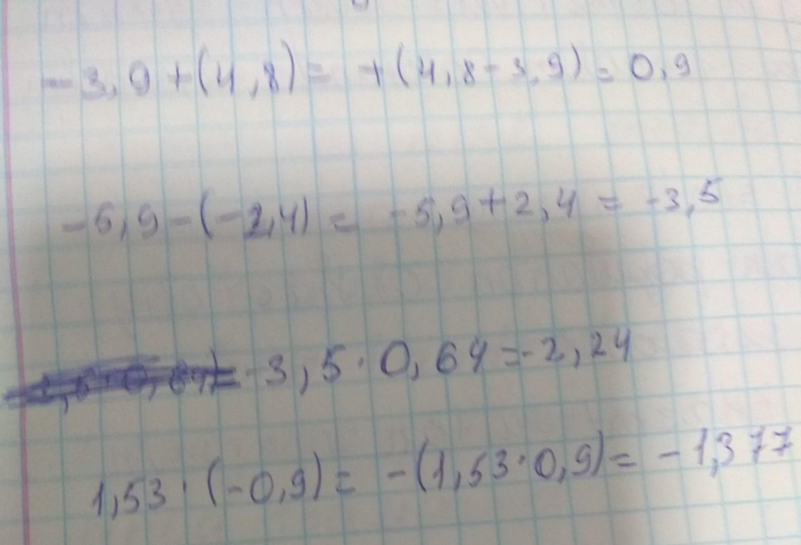 1) -3,9+(4,8) 2)-5,9-(-2,4) 3) -3,5×0,6 4), 1,53÷(-0,9)