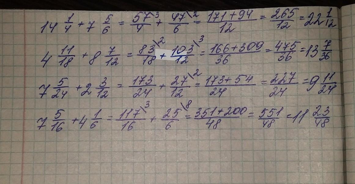 3) 7 5/24 + 2 3/12 = 7 5/24 + 2 6/24 = 9 11/24