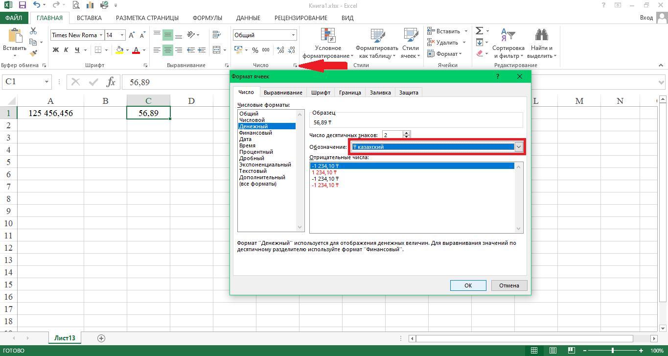 На вкладке Число выбираем в списке формат Денежный выбираем из выпадающего списка Обозначение казахский, уточняем Число десятичных знаков