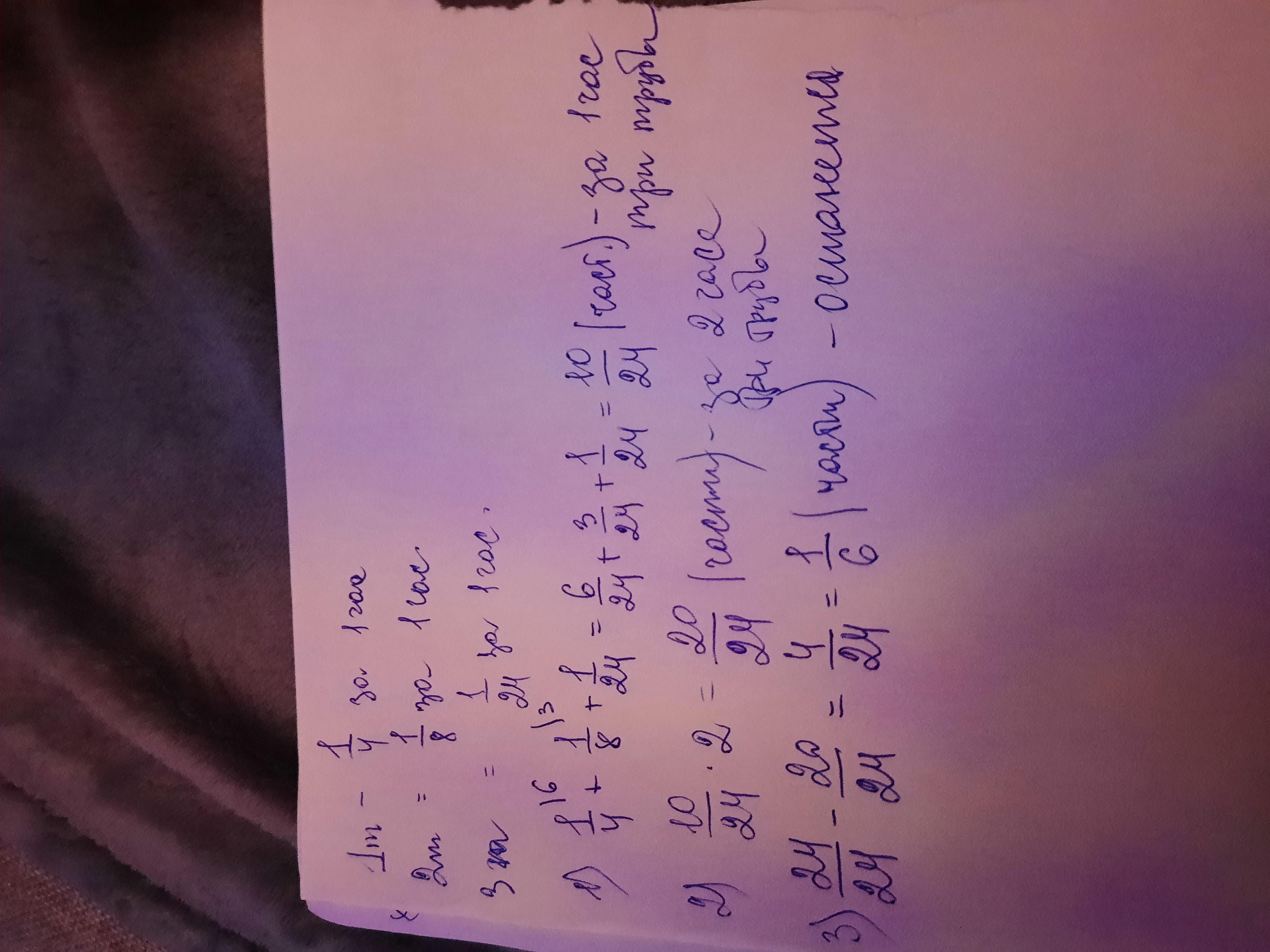 4) 1/4 + 1/8 + 1/24 = 6/24 + 3/24 + 1/24 = 10/24 = 5/12 (часть) - водоёма заполняют за 1 час три трубы