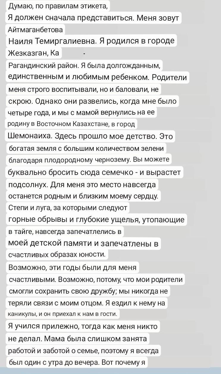 Temirgalievna. I was born in the city of Zhezkazgan, Ka-
