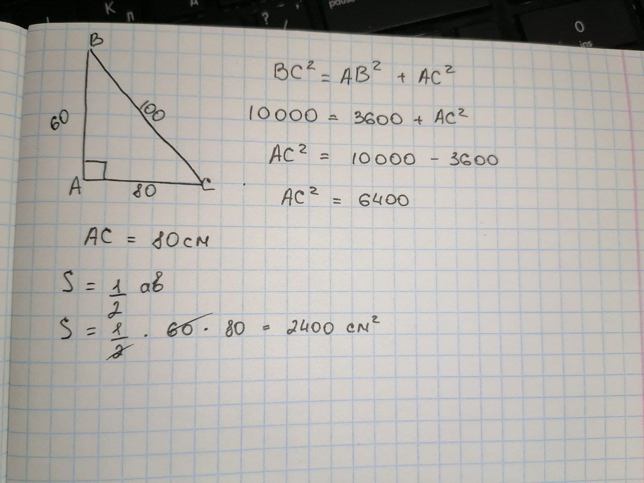 Катет прямоугольного треугольника равен 60см а гипотенуза равна 100см. Найди площадь треугольника.
