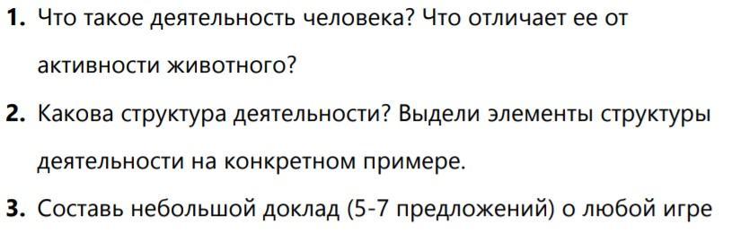 1.Деятельность — совершение человеком последовательности физических и (или) умственных действий, направленных на достижение конкретной цели.Человеческая деятельность:человек может разговаривать,строить,думать,читать,писать,он может ещё учится и много чего ещё.