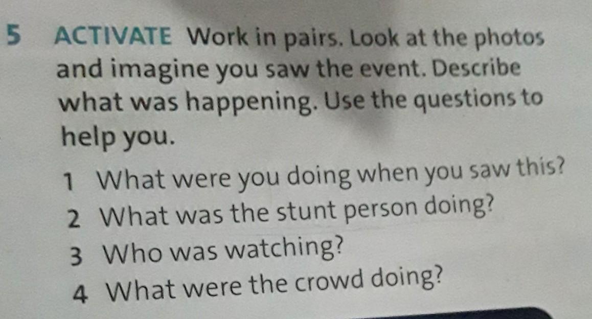 5 ACTIVATE Work in pairs. Look at the photos and imagine you saw the event. Describe what was happening. Use the questions to help you.