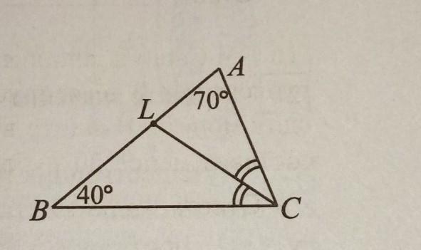 отрезок CL - биссектриса треугольника ABC. найдите величину угла ALC (в градусах), если известно, что угол А =70 градусам, угол В = 40 градусам.