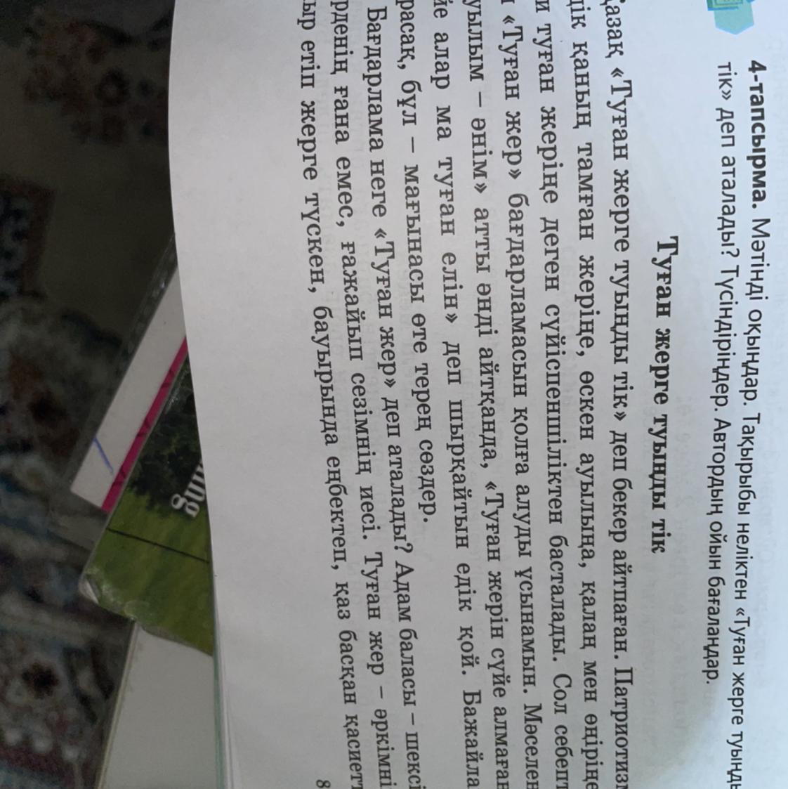 Бірыншы сөйлем: менің ойымша, Туған жер бағдарламасын ұлы адам және өз Отанының патриоты жасаған.Екіншы сөйлем :мен мұны бұл адам өз ұлтын Патриот болу үшін біріктіруге тырысқанымен түсіндірдім. елдер мен ұлттар.Үшіншы сөйлем: менің ойымша, бұл адам өз елінің патриоты ретінде өте жақсы жұмыс жасады, ол өз халқын біріктіргісі келді, оны өз елінің патриоты болу үшін өз Отаны мен жерін жақсы көреді.Сонғы сөйлем: менің ойымша, бұл адам өз елінің патриоты ретінде өте жақсы жұмыс жасады, ол өз халқын біріктіргісі келді, оны өз елінің патриоты болу үшін өз Отаны мен жерін жақсы көреді.
