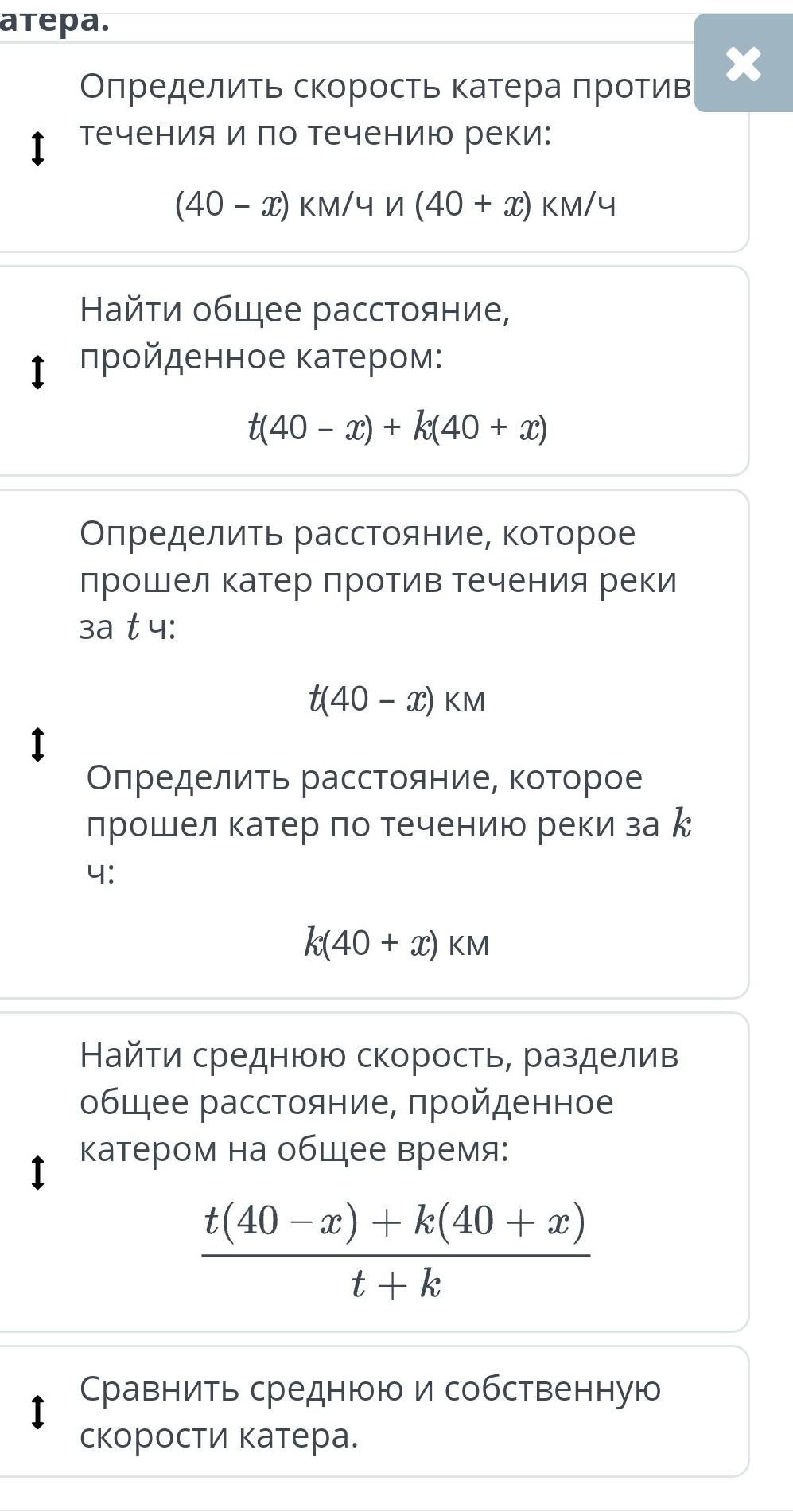 Переменная. Выражение с переменной. Урок 1 Катер проплыл t ч против течения и k ч по течению реки. Известно, что его скорость составляет 40 км/ч, а скорость течения реки – x км/ч. Определи правильный алгоритм для сравнения средней скорости и собственной скорости катера. Сравнить среднюю и собственную скорости катера. Определить скорость катера против течения и по течению реки: (40 – x) км/ч и (40 + x) км/ч Определить расстояние, которое прошел катер против течения реки за t ч: t(40 – x) км Определить расстояние, которое прошел катер по течению реки за k ч: k(40 + x) км Найти общее расстояние, пройденное катером: t(40 – x) + k(40 + x) Найти среднюю скорость, разделив общее расстояние, пройденное катером на общее время: Назад Проверить Нашли ошибку в уроке?
