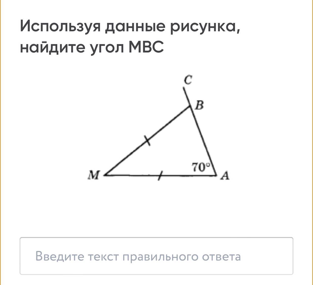 Значит угол А равен углу В как углы при основании . угол МВС смежный с углом МВА. смежные углы в сумме дают 180°. угол МВС=180°-70°=110°.