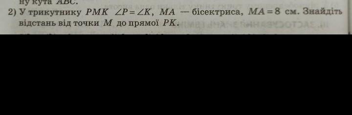 Расстояние от точки М до прямой РК и есть длина биссектрисы, т.е. оно равно 8см, т.к. углы при основании РК равны по условию, а по признаку равнобедренного треугольника этот треугольник оказывается равнобедренным, тогда биссектриса, проведенная к основанию, становится и высотой, которую мы ищем.