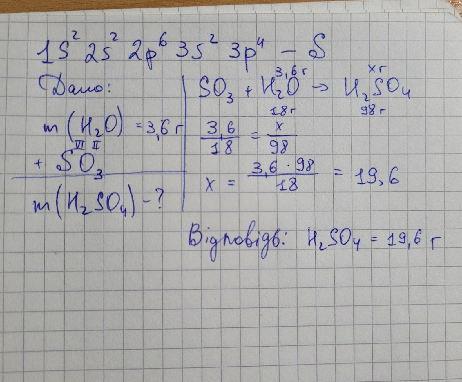 СРОЧНО!!! Електронна формула хімічного елемента 1s2 2s2 2p6 3s2 3p4 . Обчисліть масу речовини яку отримали під час взаємодії вищого оксиду цього елемента з 3.6 г води