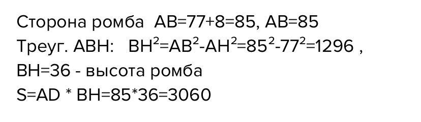 Высота BH ромба ABCD делит его сторону AD на отрезки AH = 77 и HD = 8. Найдите площадь ромба.