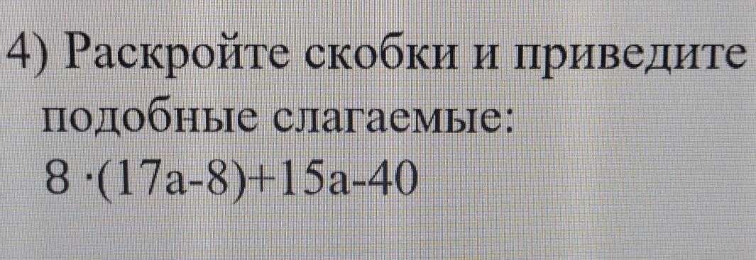 4) Раскройте скобки и приведите подобные слагаемые: 8-(17a-8)+15a-40