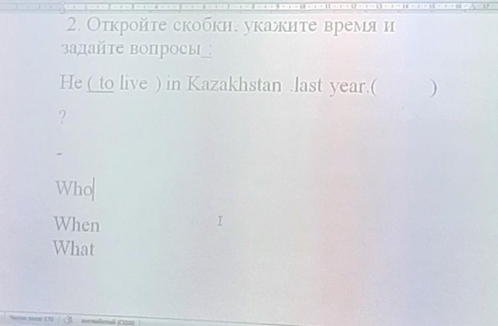 2. Откройте скобки, укажите время и задайте вопросы: He to live ) in Kazakhstan last year.( ? Who 1 When What ardcordicing Da tus -