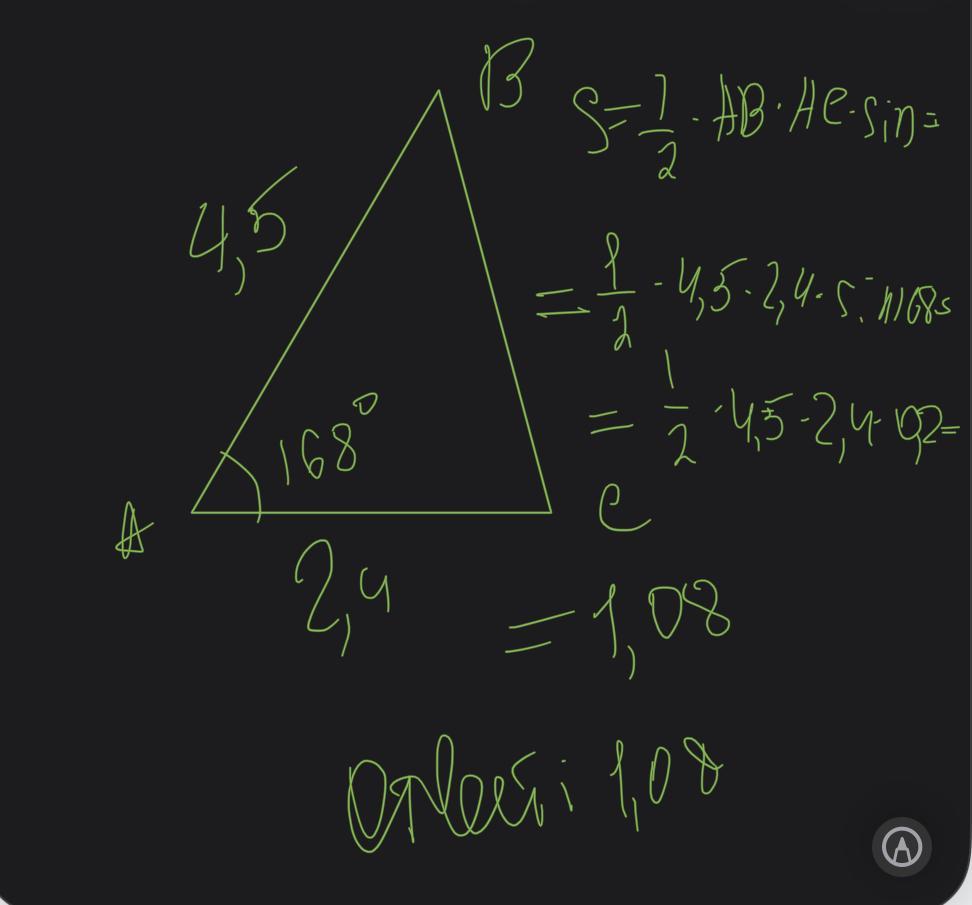 Посчитайте площадь треугольника ABC ,если известно что AB=4,5 AC=2,4 угол А =168°