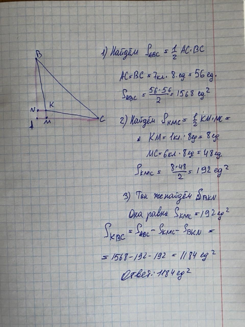 на бумаге в клетку нарисовали треугольник. Длина стороны клетки – 8 условных единиц. Найди площадь треугольника