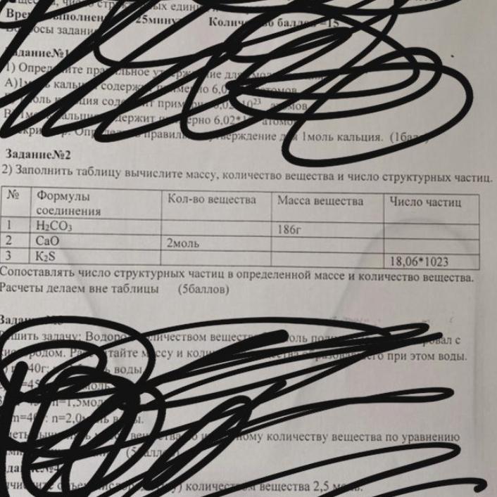 2) Заполнить таблицу вычислите массу, количество вещества и число структурных частиц.