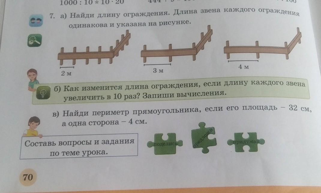 00 7. а) Найди длину ограждения. Длина звена каждого Ограждения одинакова и указана на рисунке. H** - 2 м 3 м 4 м б) Как изменится длина ограждения, если длину каждого звена увеличить в 10 раз? Запиши вычисления. в) Найди периметр прямоугольника, если его площадь а одна сторона - 4 см. 32 см,