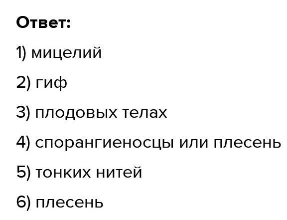 тело гриба представляет собой ... .оно называется ... .на ... шляпочных грибов вырастает ... , которые состоит из ... и ... . ... служит для образования спор.