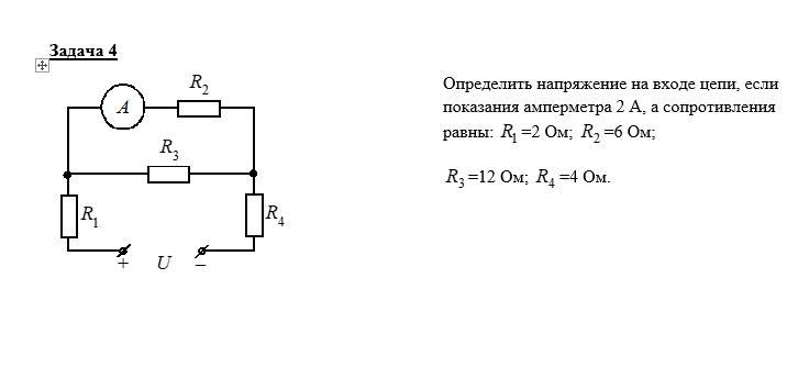Определить напряжение на входе цепи, если показания амперметра 2 А, а сопротивления равны: =2 Ом; =6 Ом;