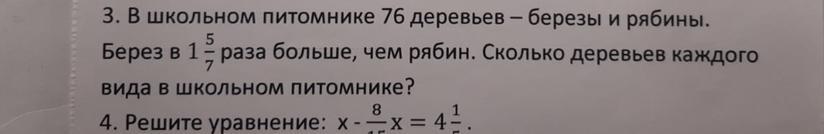 В школьном питомнике 76 деревьев - дерезы и рябины. Берёз в 1 5/7 раза больше, чем рябин. Сколько деревьев каждого вида в школьном питомнике? Желательно решите на листочке пожалуйста.