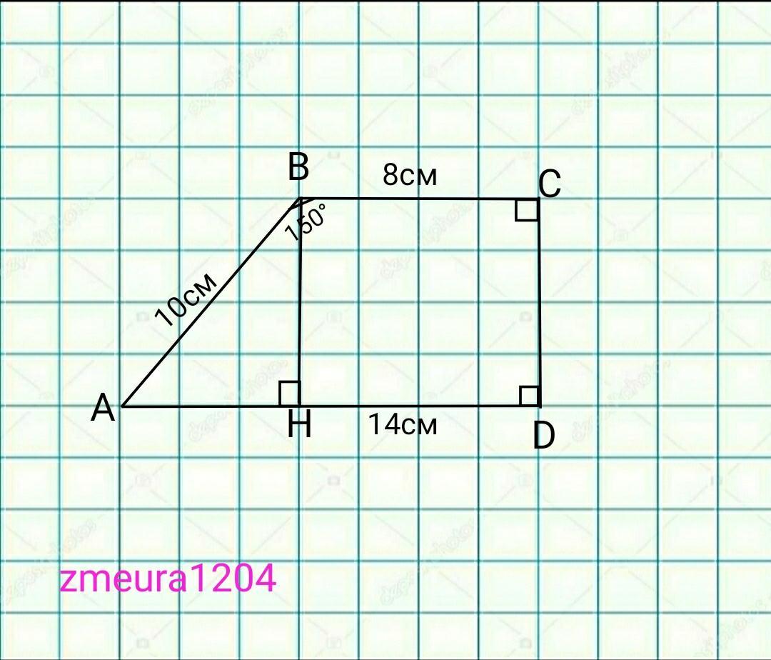 Основания прямоугольной трапеции равны 14 и 8 см а боковая сторона 10 угол при меньшем основании 150гр. Найти площадь трапеции