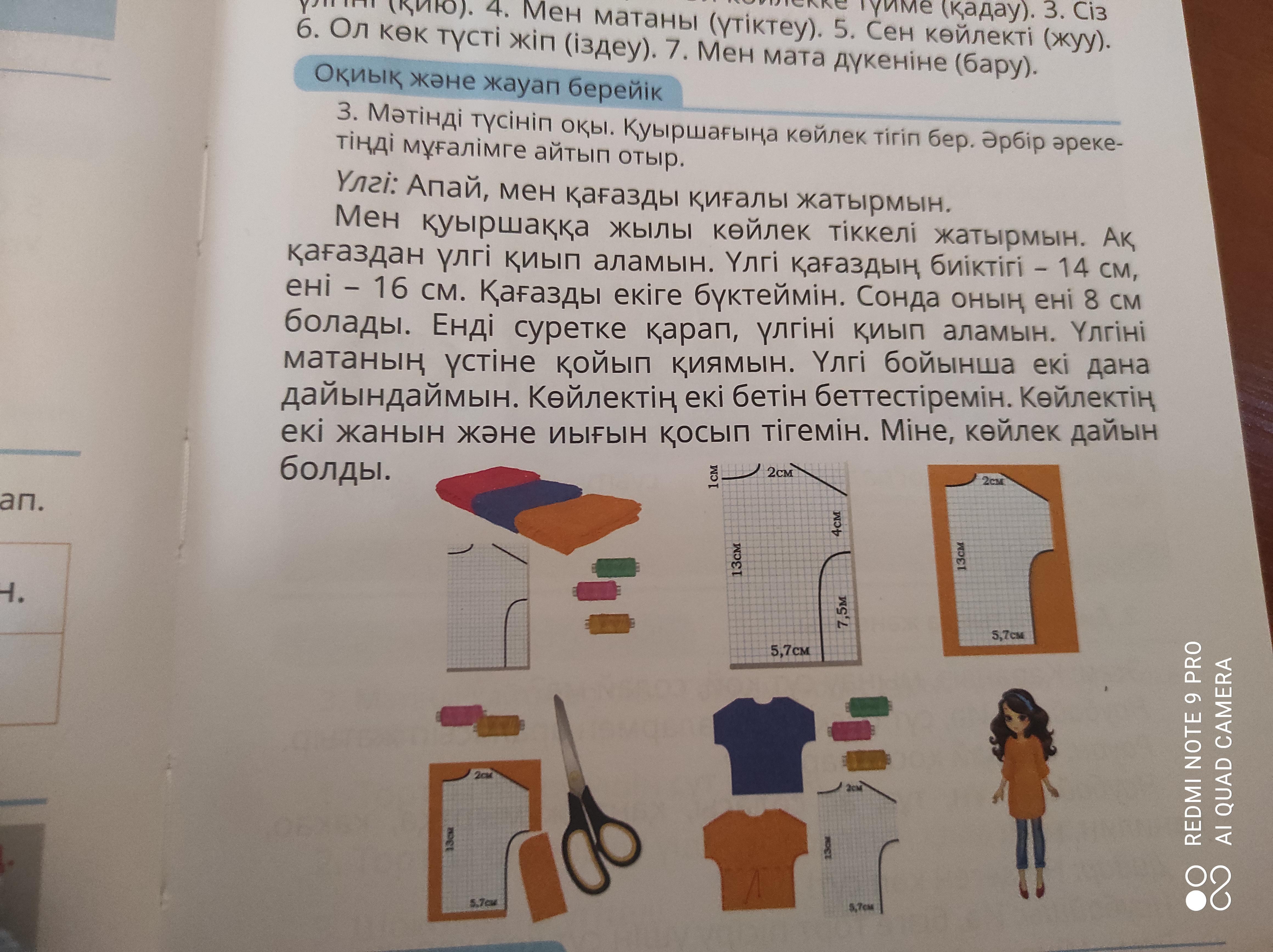 мен өзімнің қуыршағыма көйлек тігіп жатырмын енді мен матаны алап оның енін 16 см биіктігін 14см қылдым менде 3 түрлі маталар болды.Мен оларды пайдаланып ен бірінші қуыршаққа жейде тіктің қағаз бойына жейденің суретін салып пішіндедімі.Одан қағаздың бойынан матаны қойып жай кестім және оны тігіп бастадым осылай қуыршағыма әдемі жейде тіктім