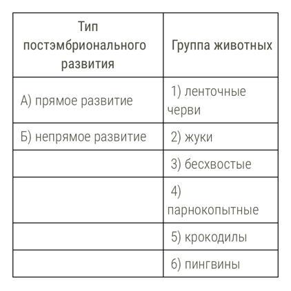 Установи соответствие между типом постэмбрионального развития и группой животных.