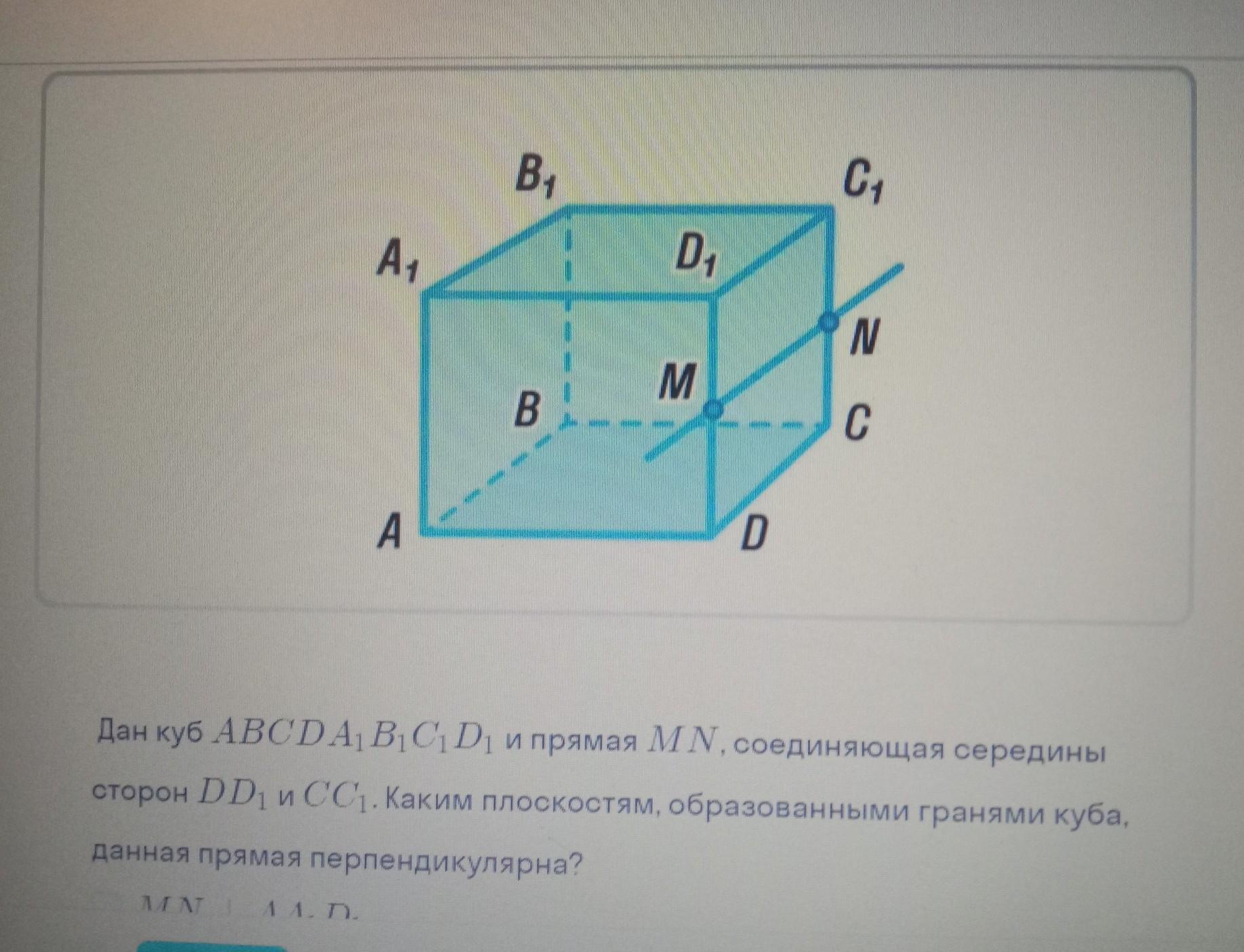 дан куб ABCDA1B1C1D1 и прямая MN, соединяющая средины сторон DD1 и CC1. Каким плоскостям, образованными гранями куба, данная прямая перпендикулярна?