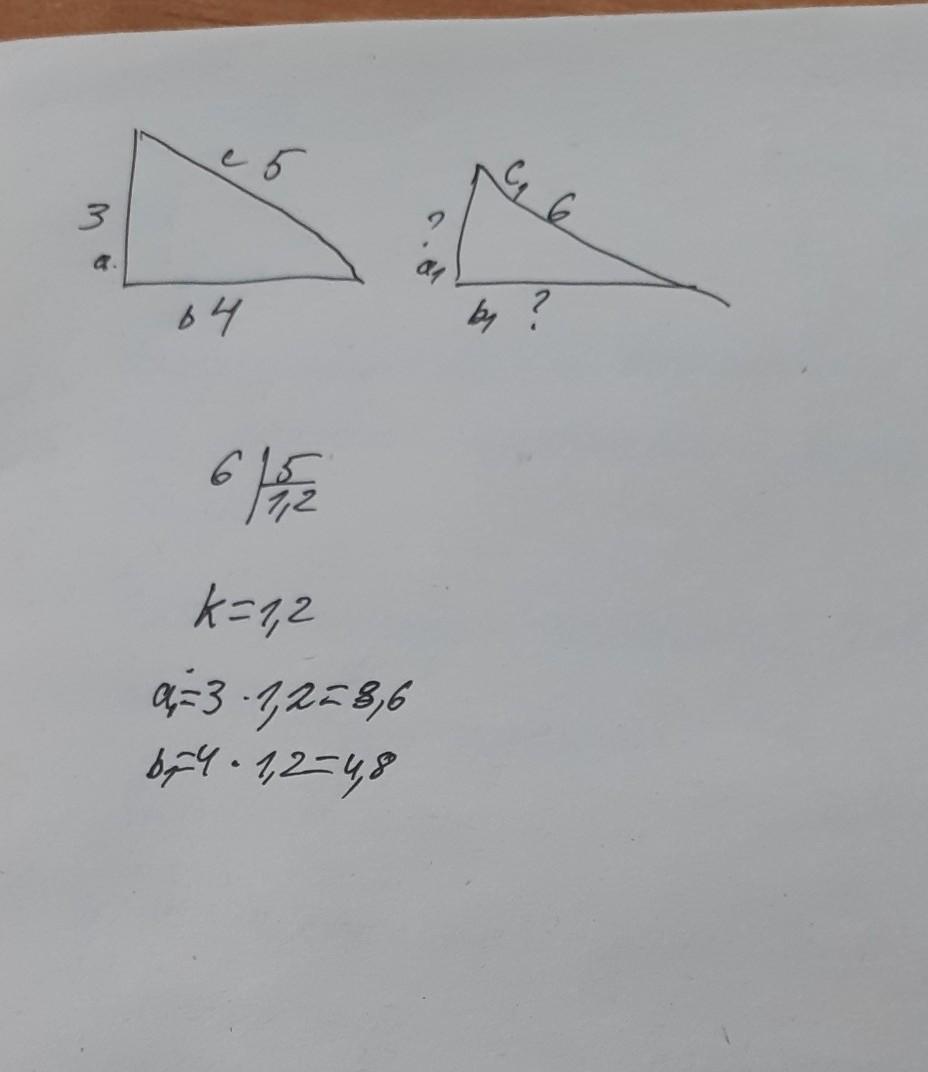 4. Катеты прямоугольного треугольника равны 3 см и 4 см. Най- те катеты подобного прямоугольного треугольника, гипоте которого равна 6 см: