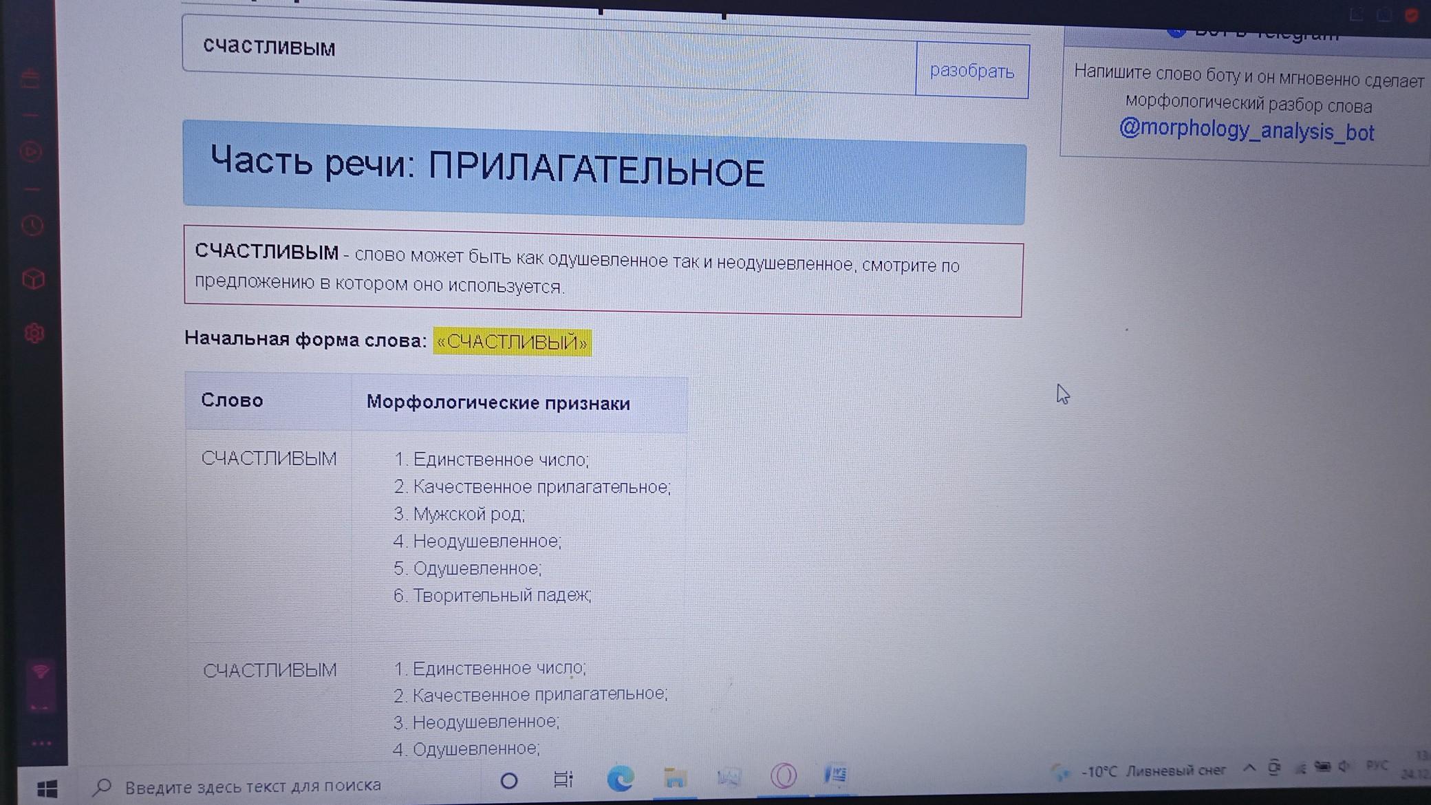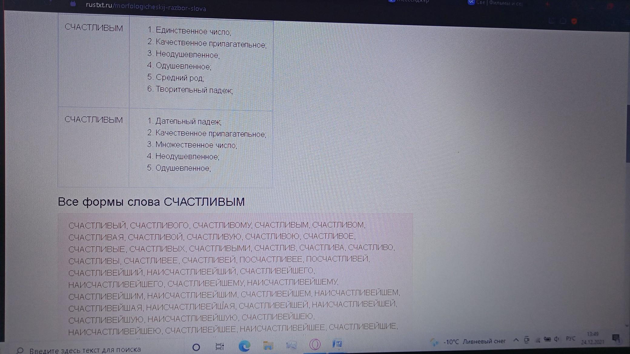 . Разбор слова "счастливым". Начальная форма: счастливый. Часть речи: Имя прилагательное. Грамматика: единственное число, творительный падеж, неодушевленное, мужской род