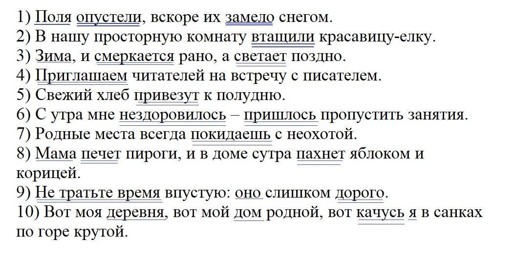 1. Спишите предложения, подчеркните грамматические основы, определите тип односоставных предложений (в том числе в составе сложных): 1) Поля опустели, вскоре их замело снегом. 2) В нашу просторную комнату втащили красавицу елку. 3) Зима, и смеркается рано, а светает поздно. 4) Приглашаем читателей на встречу с писателем. 5) Свежий хлеб привезут к полудню. 6) С утра мне нездоровилось – пришлось пропустить занятия. 7) Родные места Всегда покидаешь с неохотой. 8) Мама печет пироги, и в доме сутра пахнет яблоком и корицей. 9) Не тратьте время впустую: оно слишком дорого. 10) Вот моя деревня, вот мой дом родной, вот качусь я в санках по горе крутой.
