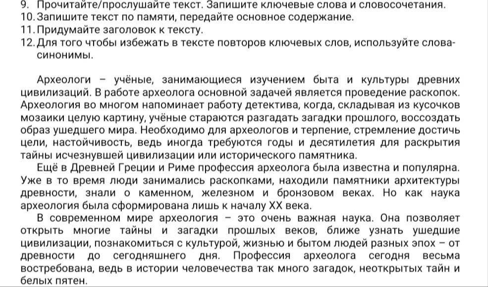Прочитайте/прослушайте текст. Запишите ключевые слова и словосочетания. Запишите текст по памяти, передайте основное содержание. Придумайте заголовок к тексту. Для того чтобы избежать в тексте повторов ключевых слов, используйте слова- синонимы. Археологи – учёные, занимающиеся изучением быта и культуры древних цивилизаций. В работе археолога основной задачей является проведение раскопок. Археология во многом напоминает работу детектива, когда, складывая из кусочков мозаики целую картину, учёные стараются разгадать загадки прошлого, воссоздать образ ушедшего мира. Необходимо для археологов и терпение, стремление достичь цели, настойчивость, ведь иногда требуются годы и десятилетия для раскрытия тайны исчезнувшей цивилизации или исторического памятника. Ещё в Древней Греции и Риме профессия археолога была известна и популярна. Уже в то время люди занимались раскопками, находили памятники архитектуры древности, знали о каменном, железном и бронзовом веках. Но как наука археология была сформирована лишь к началу ХХ века. В современном мире археология – это очень важная наука. Она позволяет открыть многие тайны и загадки прошлых веков, ближе узнать ушедшие цивилизации, познакомиться с культурой, жизнью и бытом людей разных эпох – от древности до сегодняшнего дня. Профессия археолога сегодня весьма востребована, ведь в истории человечества так много загадок, неоткрытых тайн и белых пятен.