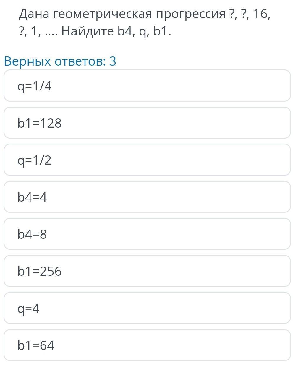 Дана геометрическая прогрессия ?, ?, 16, ?, 1, ....Найдите b4, q, b1.