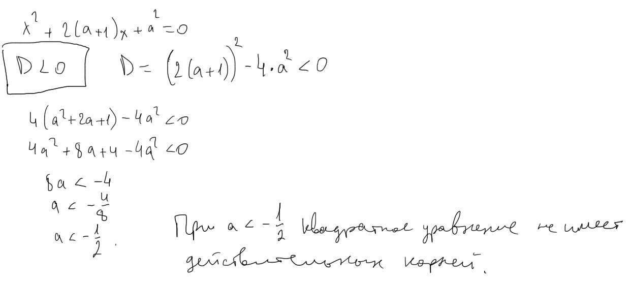 Дуде треба!При яких значеннях а квадратне рiвняння x ^ 2 + 2(a + 1) * x + a ^ 2 = 0 не має коренів?