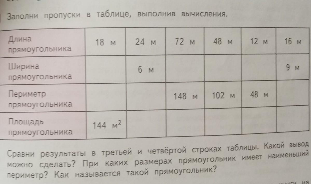 Сравни результаты в третьей и четвертой строках таблицы. Какой вывод можно сделать? При каких размерах прямоугольник имеет наименьший периметр? Как называется такой прямоугольник?