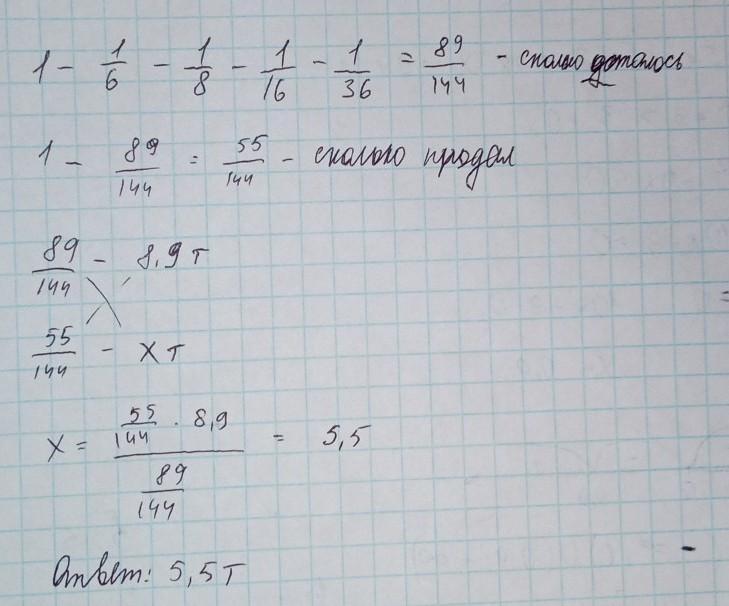 крестьянин продал сначала 1/6 потом 1/8, 1/16 и 1/36 собранного им сепа, после чего у него осталось 8,9 тонны. Сколько сепа он продал?