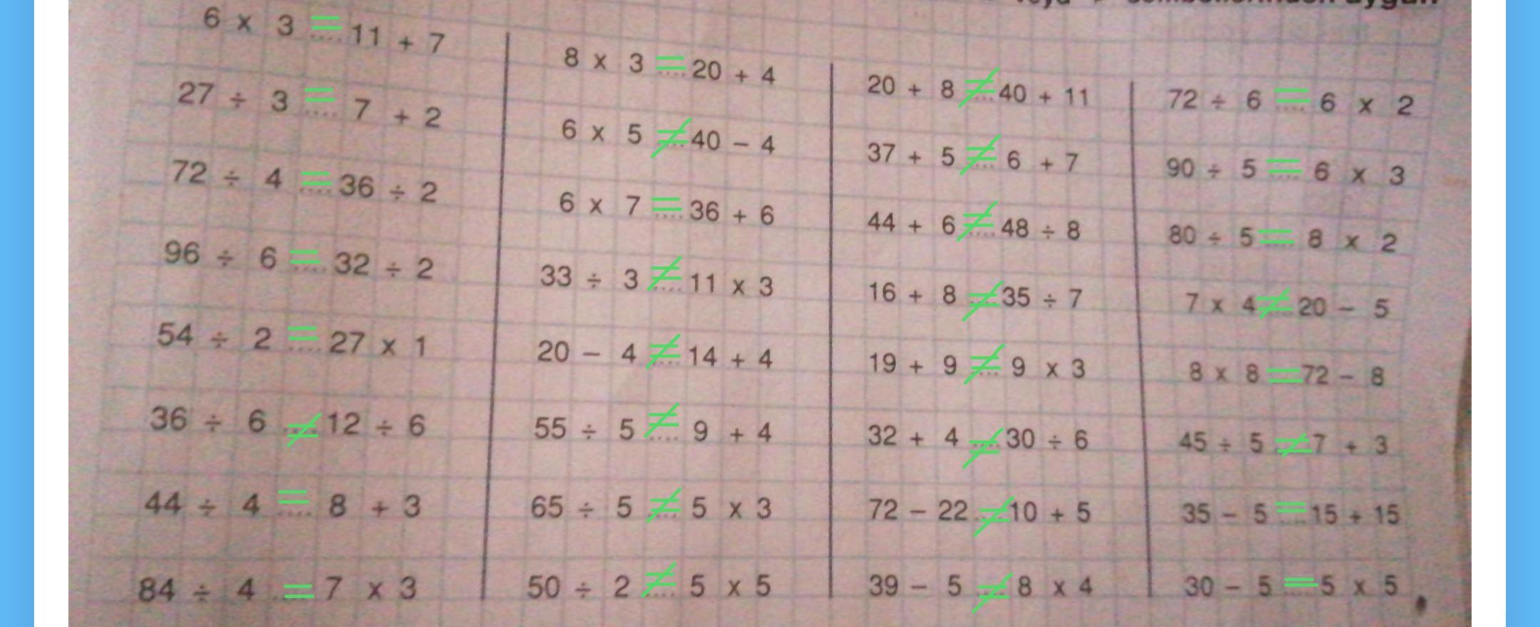 50) Aşağıdaki matematiksel ifadeler arasındaki boşluklara eşittir işaretini veya eşit değildir işareti sembollerinden uygun olananı yazalım