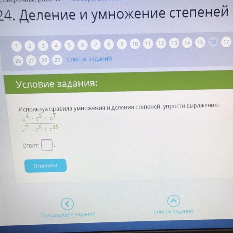 это будет z нулевой степени деленное на z нулевой степени. а по свойства степеней любое число в нулевой степени равен одному. 1/1 равен одному.