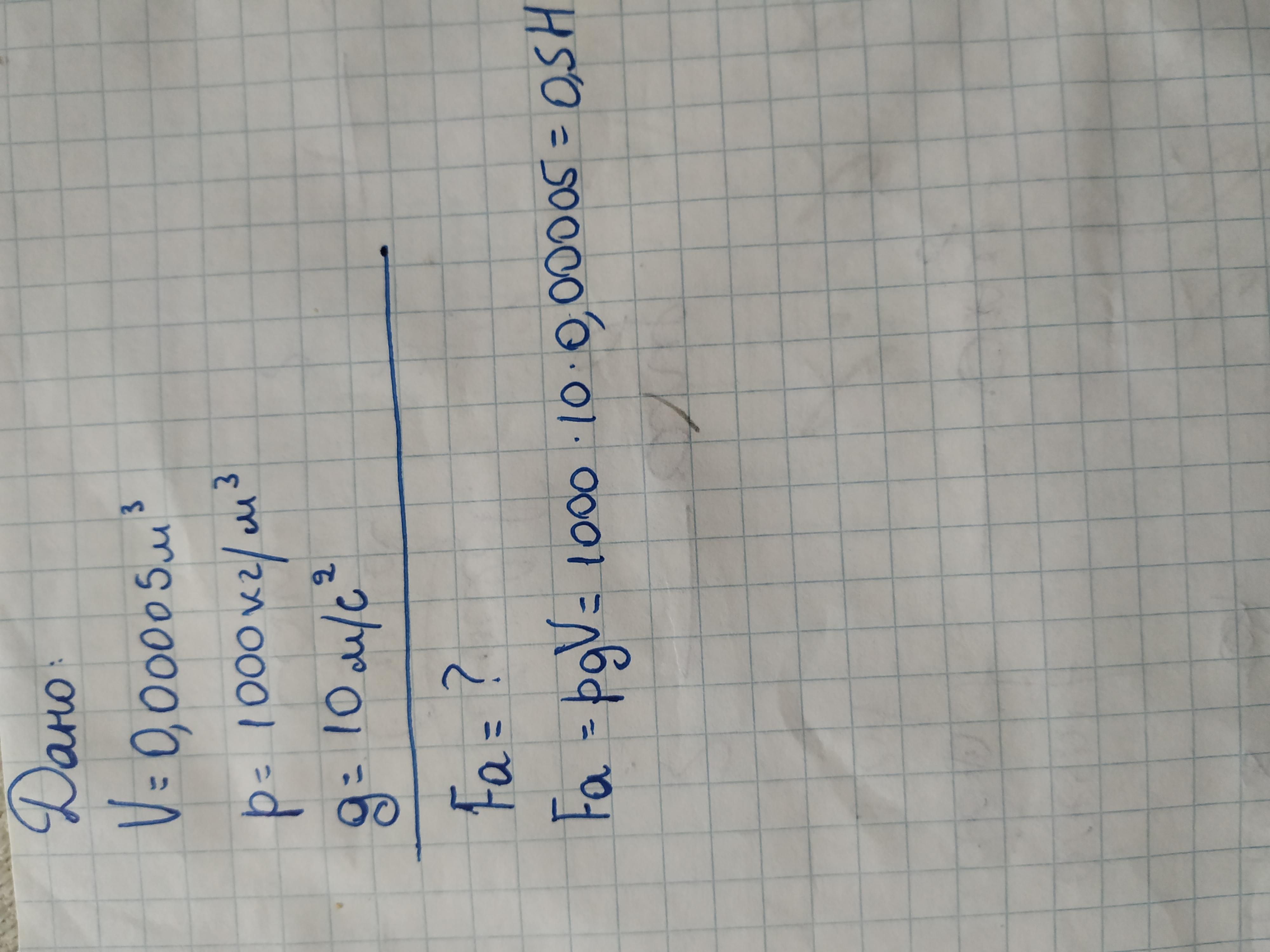 Fa=ρgV=1000*10*0,00005=0,5Н