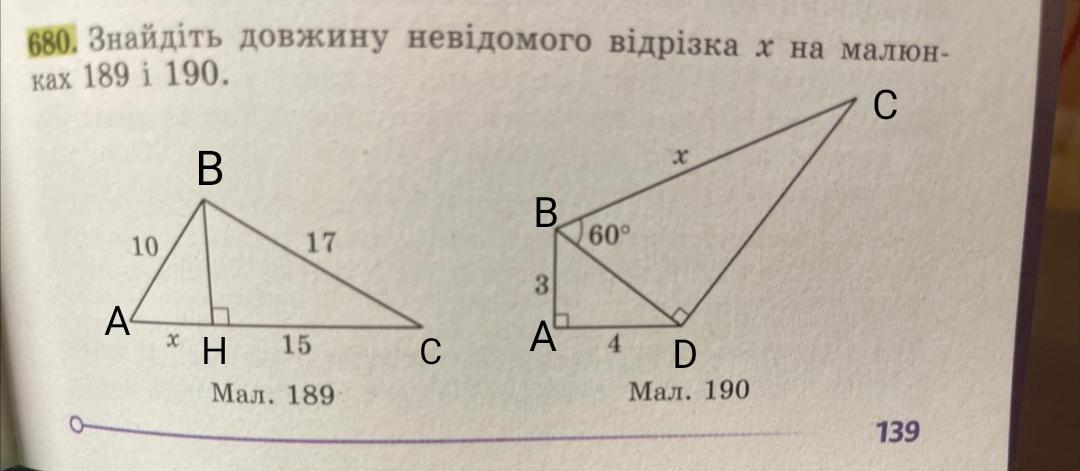 Знайдіть довжину невідомого відрізка x на малюнках 189 і 190