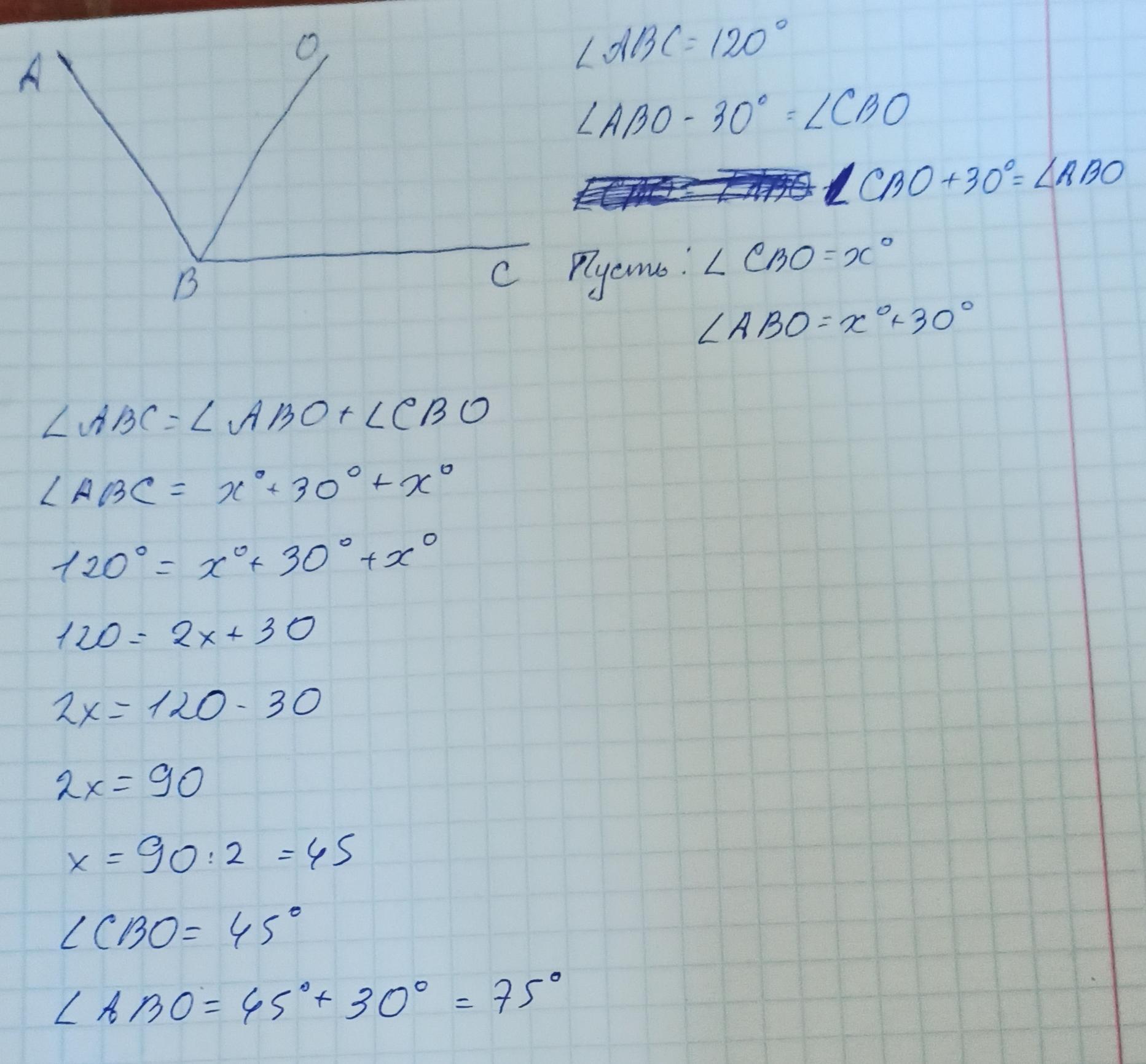 Ответ: CBO = 45 градусов, ABO = 75 градусов
