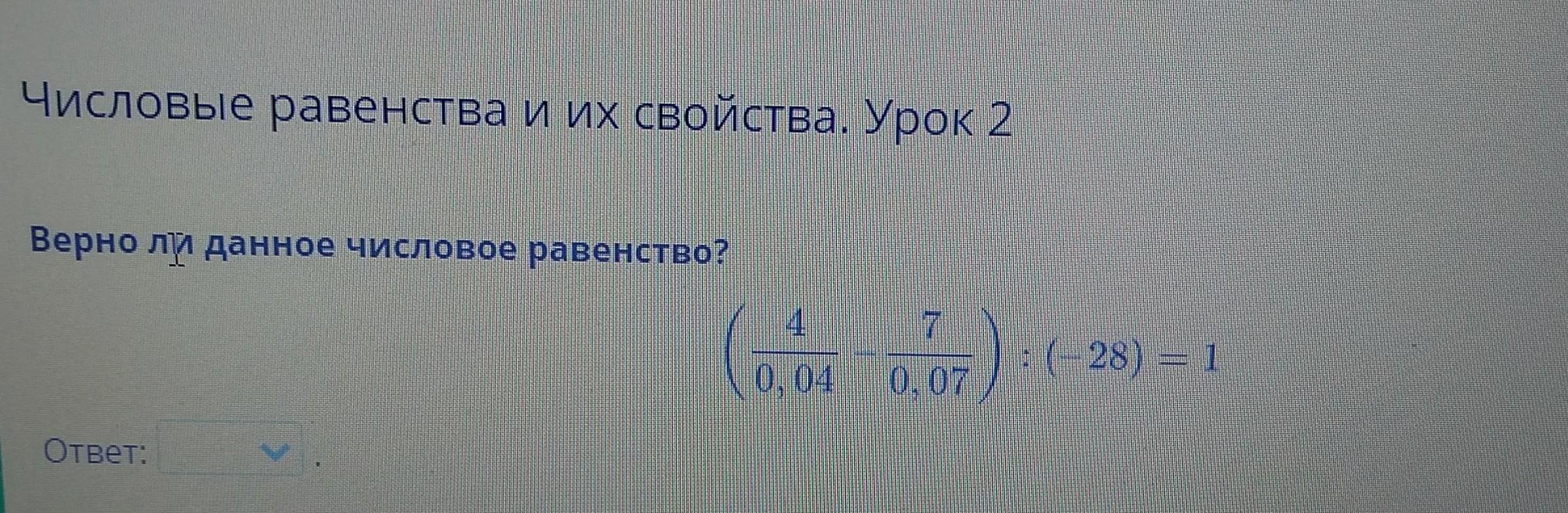 Числовые равенства и их свойства. Урок 2 Верно ли данное числовое равенство? 4 ) : (28) = 1 = 0,04 0,07 Ответ: за ответ 15 балов