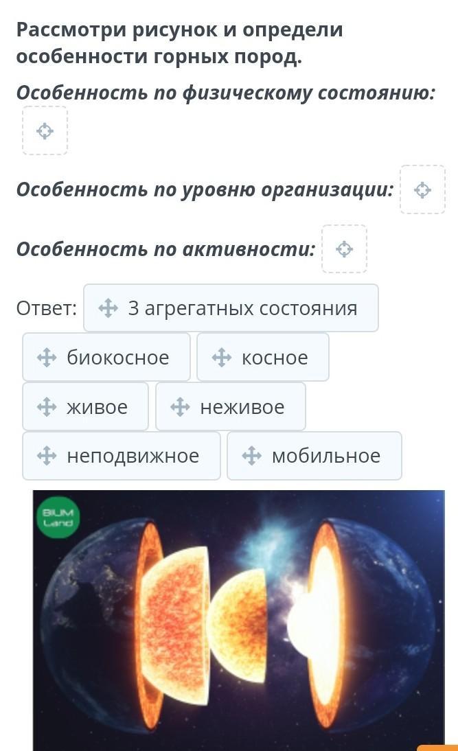 Строение и состав географической оболочки Рассмотри рисунок и определи особенности горных пород. Особенность по физическому состоянию: Особенность по уровню организации: Особенность по активности: Ответ: