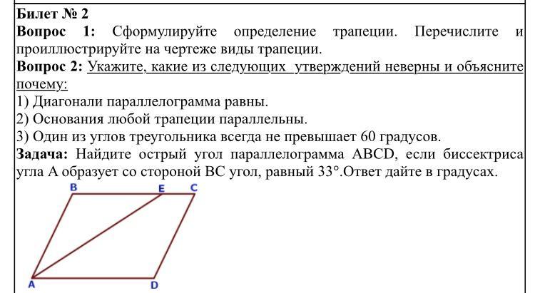 1) четырёхугольник, у которого две стороны параллельны, а две другие стороны не параллельны