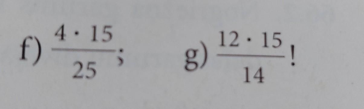 сокращаем: f) 15 и 25 сокращаем на 5, получается 4*3/5, ответ 2 2/5(две целых две пятых). g) 12 и 14 сокращаем на 2, получается 6*15/7, ответ будет 12 6/7 (двенадцать целых шесть седьмых)