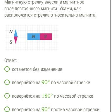Ответ: повернётся на 90 градусов против часовой стрелки, так как разноимённые полюса притягиваются